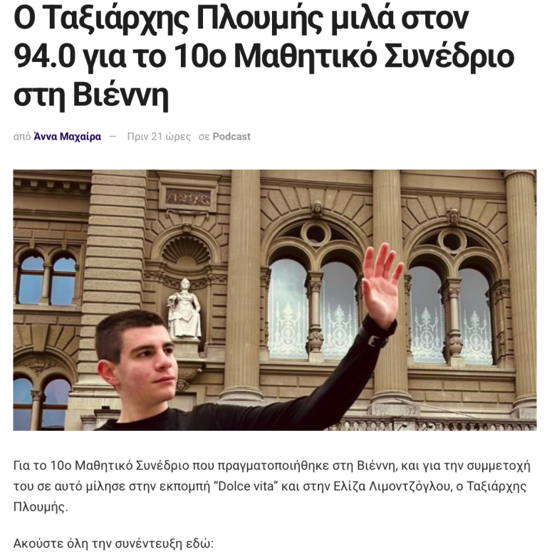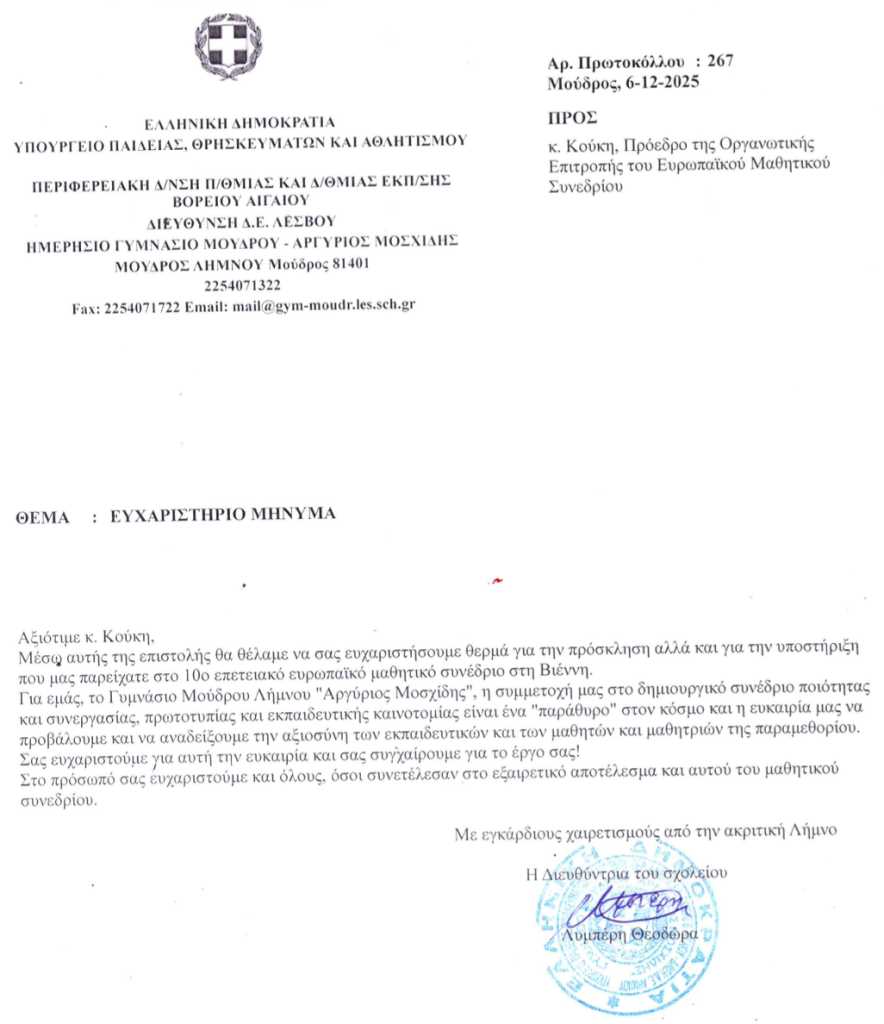Αξιότιμε κ. Κούκη, Θα θέλαμε να σας εκφράσουμε τις θερμές μας ευχαριστίες για την τιμητική πρόσκληση και την εξαιρετική διοργάνωση του 10ου Επετειακού Μαθητικού Συνεδρίου στη Βιέννη. Η συμμετοχή μας στο συνέδριο υπήρξε μια μοναδική και ανεπανάληπτη εμπειρία, που έδωσε στους μαθητές μας την ευκαιρία να παρουσιάσουν το έργο τους, να ανταλλάξουν ιδέες, να γνωρίσουν συνομηλίκους από άλλα σχολεία και να αισθανθούν μέλη μιας μεγάλης μαθητικής και πολιτιστικής κοινότητας. Για τα παιδιά της επαρχίας μας, το ταξίδι αυτό δεν ήταν απλώς μια εκπαιδευτική δραστηριότητα, αλλά ένα σημαντικό βίωμα ζωής. Η επαφή με τη Βιέννη, τον πολιτισμό της, τα μνημεία και το διεθνές περιβάλλον του συνεδρίου άνοιξε νέους ορίζοντες, ενίσχυσε την αυτοπεποίθησή τους και τους ενέπνευσε να θέτουν υψηλότερους στόχους για το μέλλον τους.