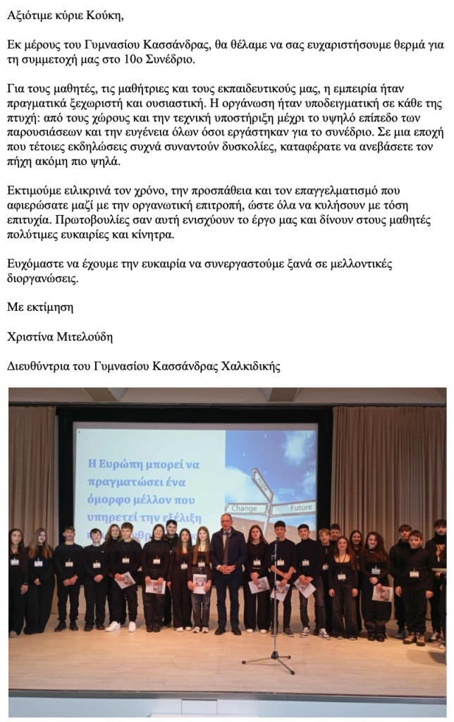 Η Διευθύντρια Γυμνασίου Καρ.. Αγαπητέ κύριε Κούκη, Σας ευχαριστούμε ειλικρινά για το ενθαρρυντικό και εμπνευσμένο μήνυμά σας. Τα λόγια σας αποτελούν ουσιαστική επιβράβευση της προσπάθειας των μαθητών και των εκπαιδευτικών που συμμετέχουν με συνέπεια και όραμα στο Ευρωπαϊκό Μαθητικό Συνέδριο κάθε χρόνο. Ο θεσμός αυτός συμβάλλει ουσιαστικά στη διαμόρφωση ενεργών και σκεπτόμενων νέων πολιτών και είναι χαρά μας να αποτελούμε μέρος αυτής της δυναμικής εκπαιδευτικής κοινότητας. Η συμμετοχή μας αποτέλεσε μια πολύτιμη εμπειρία για τους μαθητές και τις μαθήτριές μας.